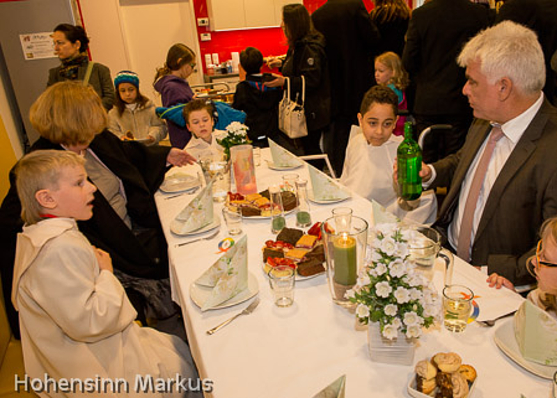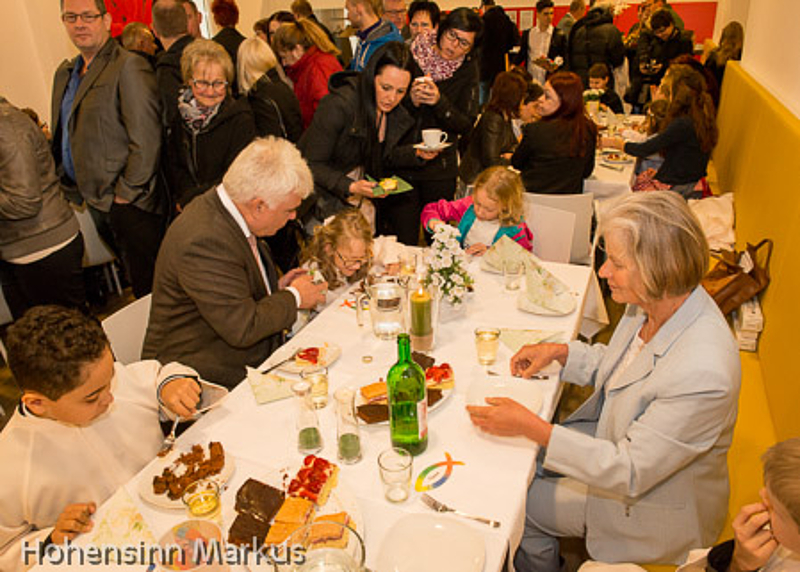 Im Anschluss an die Messe gab es für alle Apfelsaft und Kuchen im Raum der Begegnung: Ein gelungenes Fest für die Schülerinnen und Schüler beider Schulen, aber auch für deren Eltern, Paten und Verwandten.